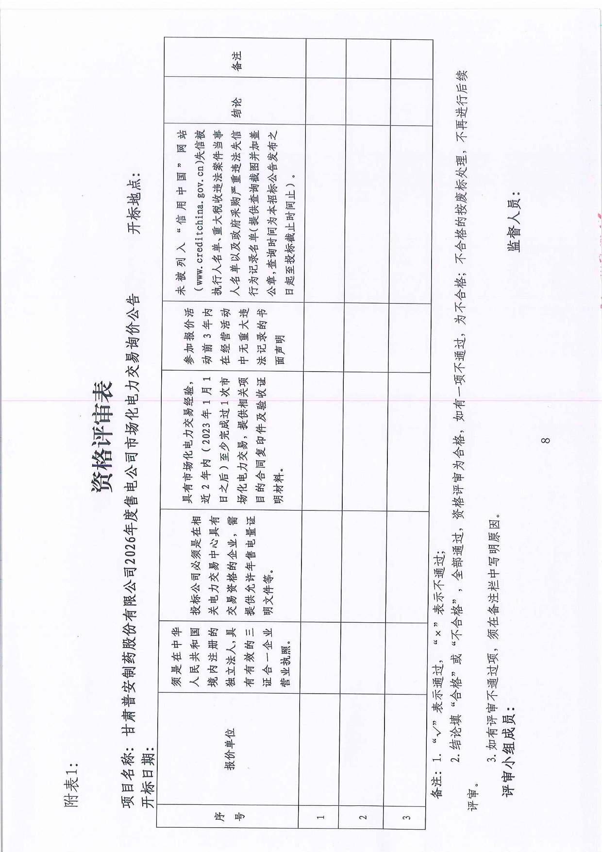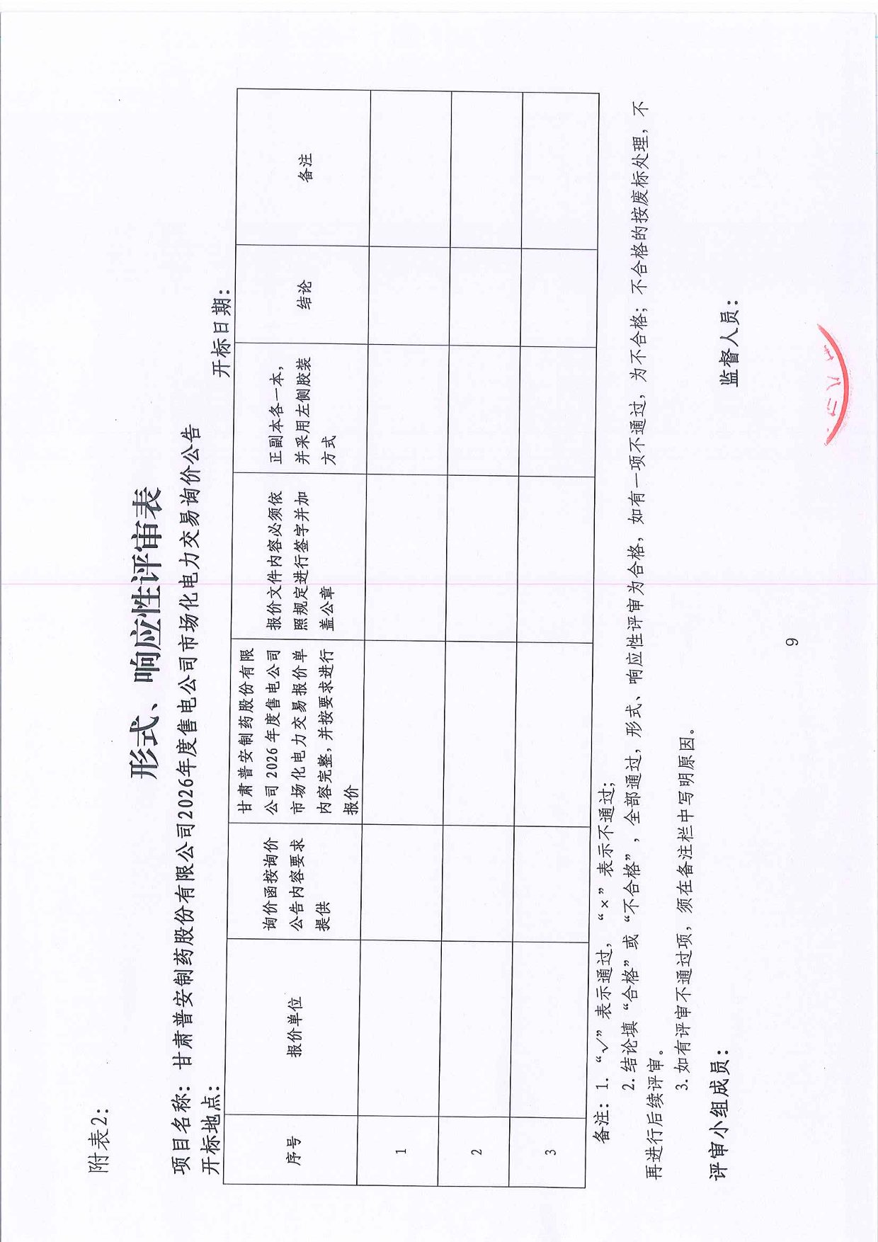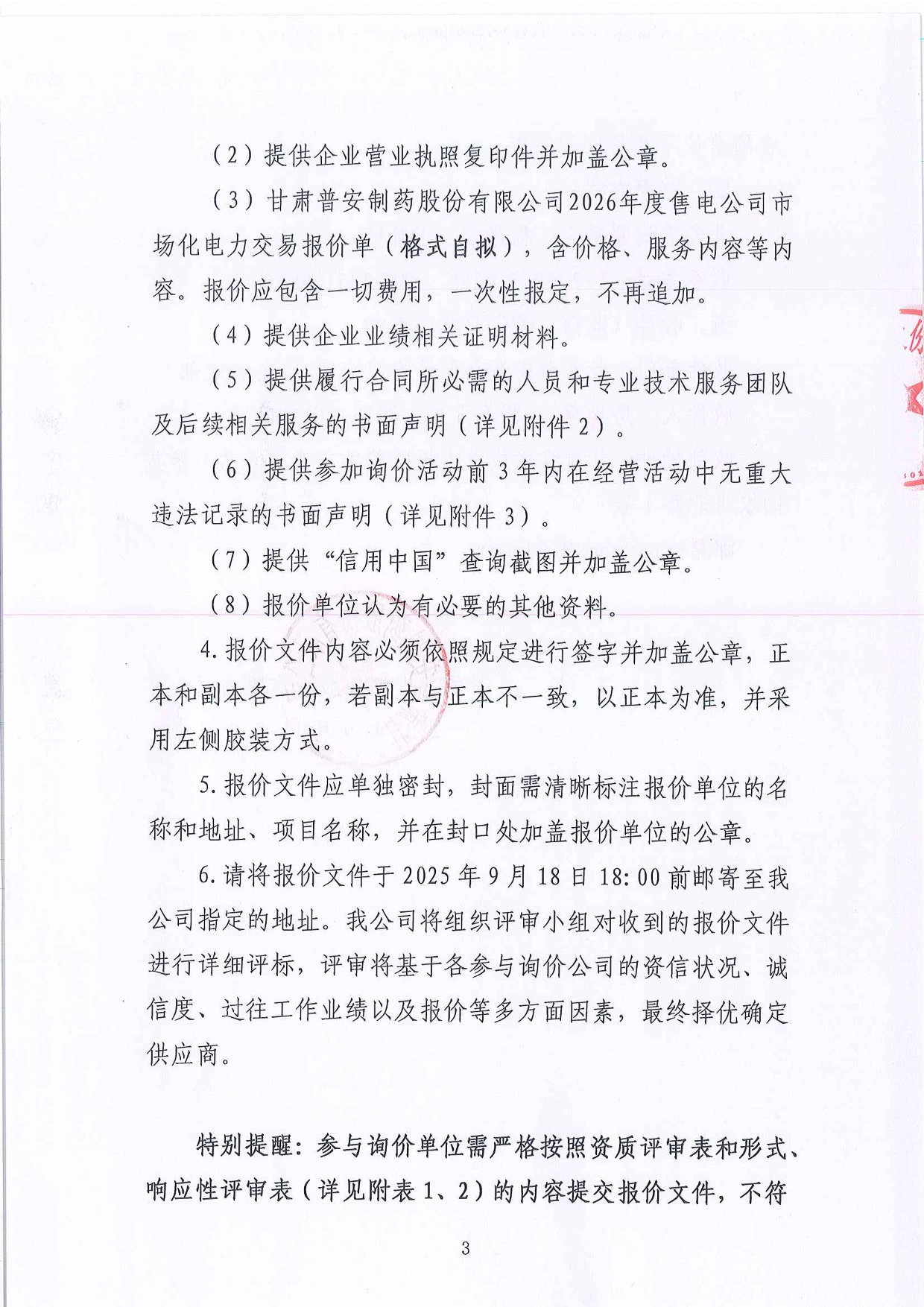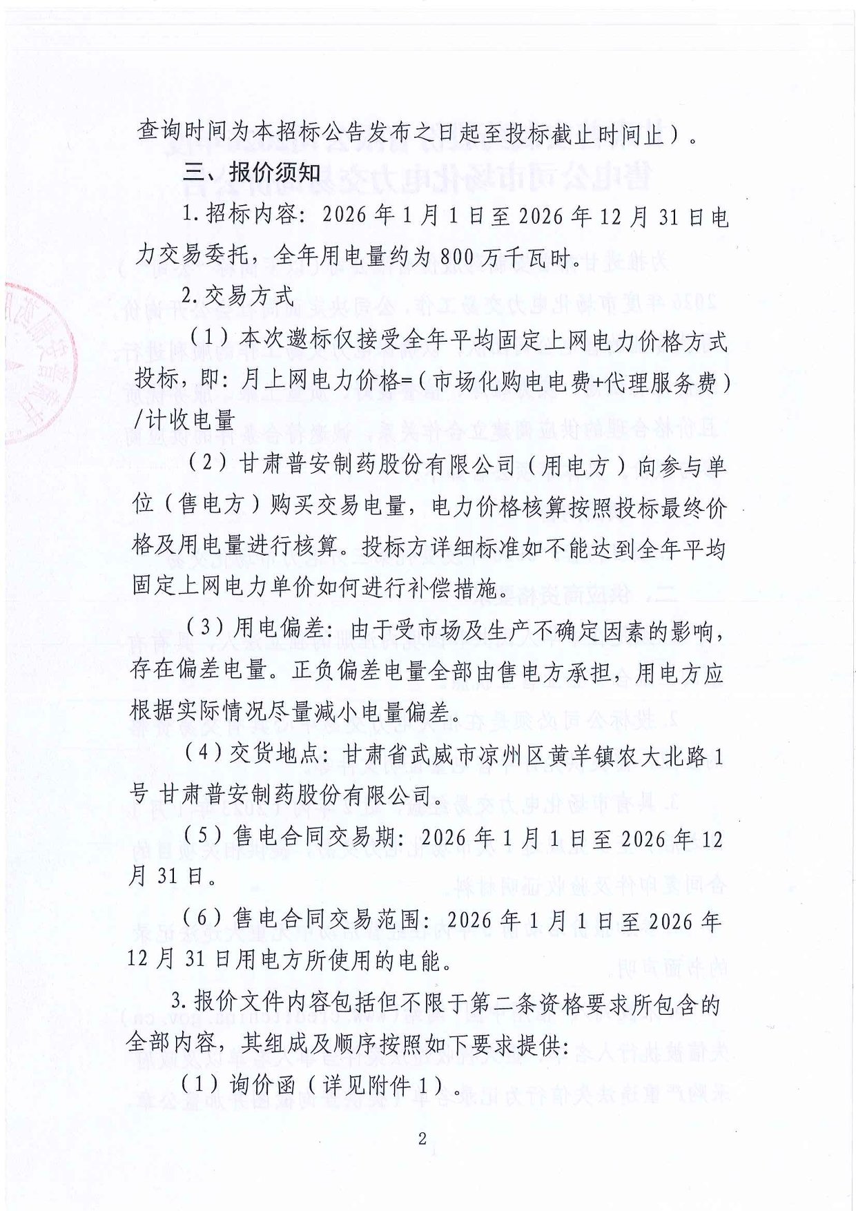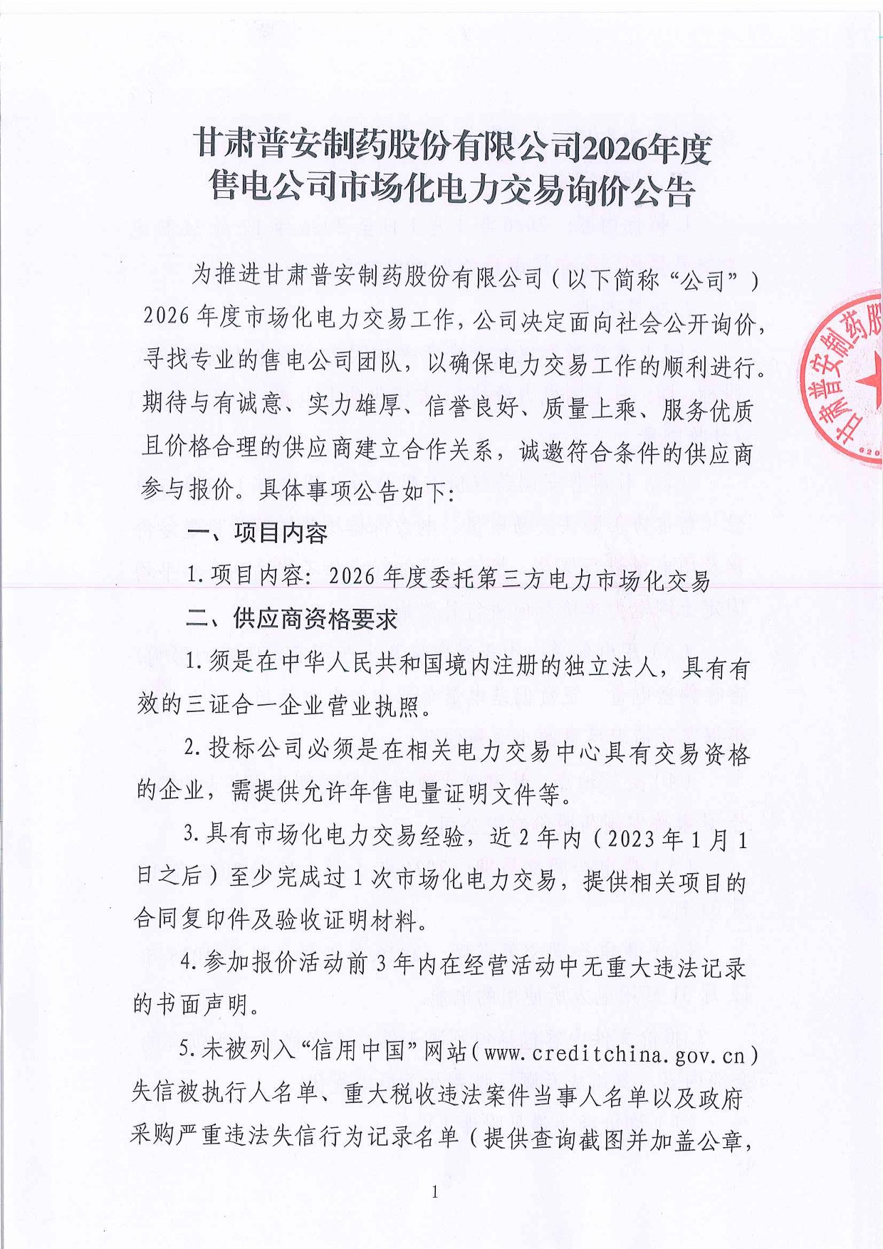 甘肅普安制藥股份有限公司2026年度售電公司市場化電力交易詢價(jià)公告