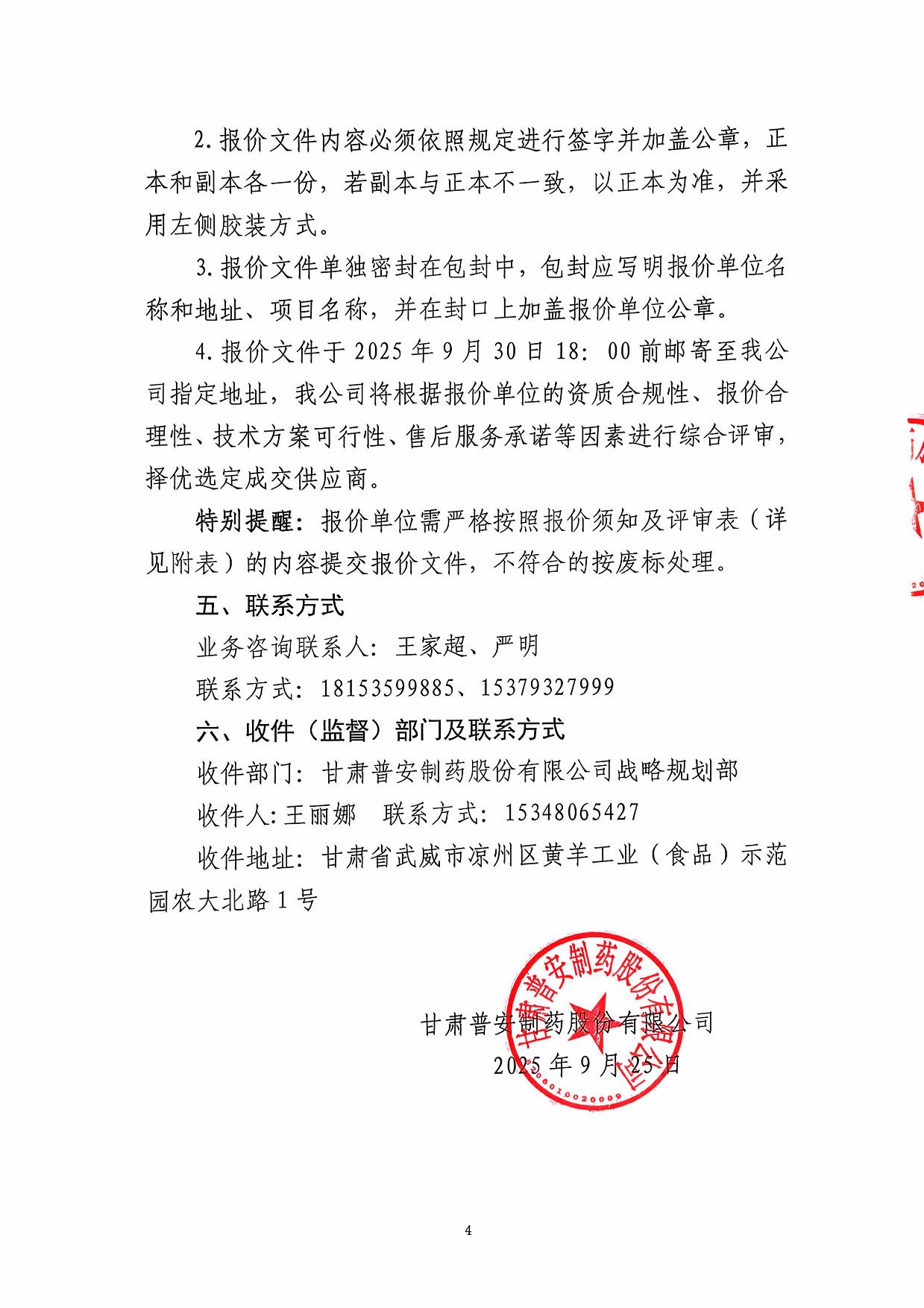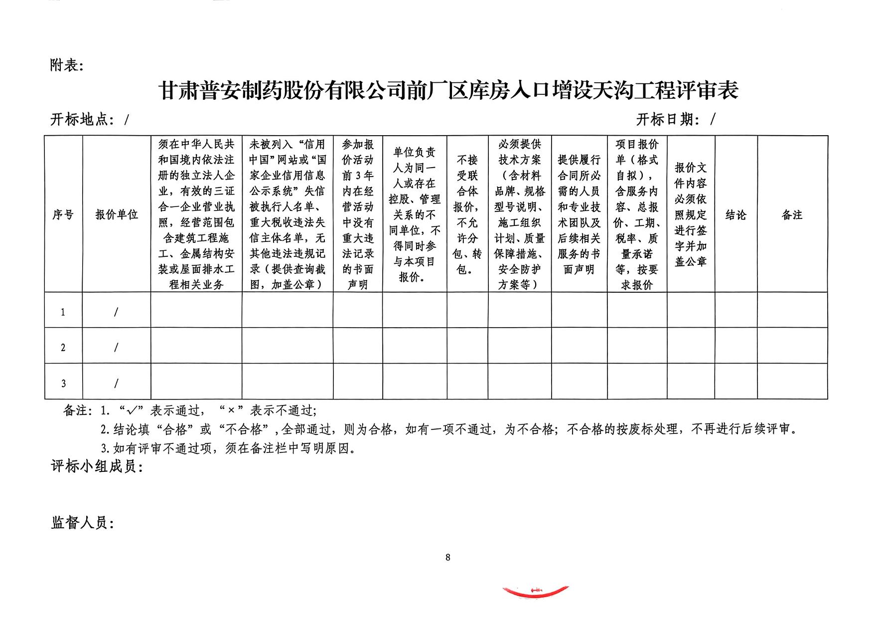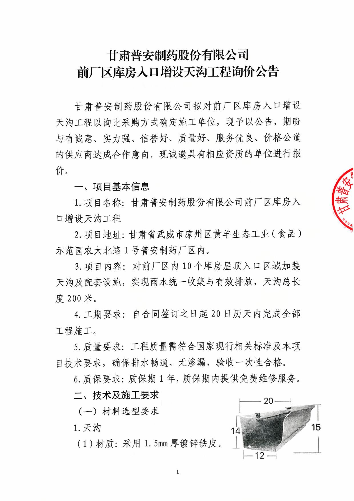 甘肅普安制藥股份有限公司前廠區(qū)庫(kù)房入口增設(shè)天溝工程詢價(jià)公告